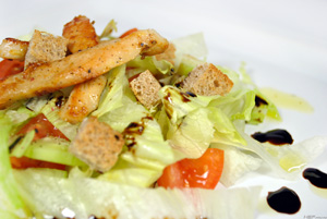 7. a salátát meglocsoljuk olívaolajjal, a méz-sűrű balzsamecettel, ráhalmozzuk a húst és a kenyérkockát